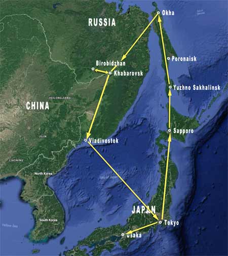 ship to Nahodka, train to Khabarovsk, and then plane to Sakhalin to